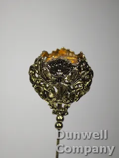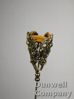 Hatpin sporting a faceted square amber stone nestled in gold filagree on an 8-inch-long shaft.