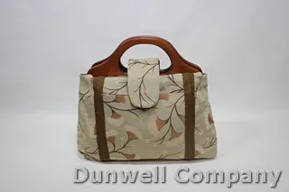 Green, Brown and Tan Ginko leaf Brocade Fabric Carpet Bag.  Brown decorative straps.  One large exterior pocket, one small and one medium interior pocket.  Brown decorative straps and large double wood handles.  Matching over strap with magnetic closure.
